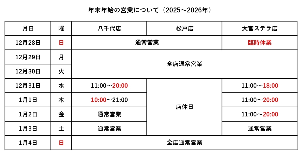 ・イオンモール 八千代緑が丘店 TEL:047-407-3287 ・松戸元山店 TEL:047-703-9716 ・大宮ステラタウン店 TEL:048-782-4508