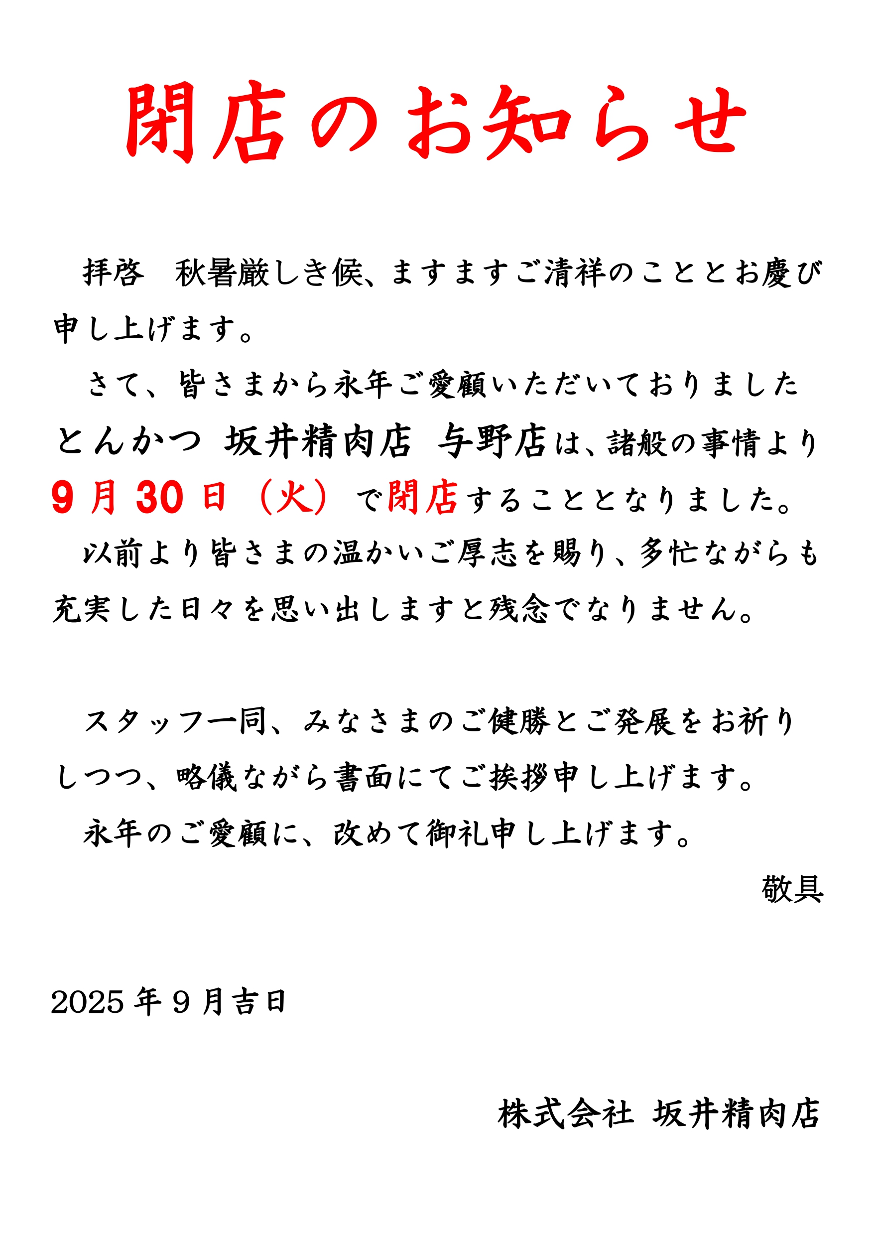 与野店 閉店のお知らせ